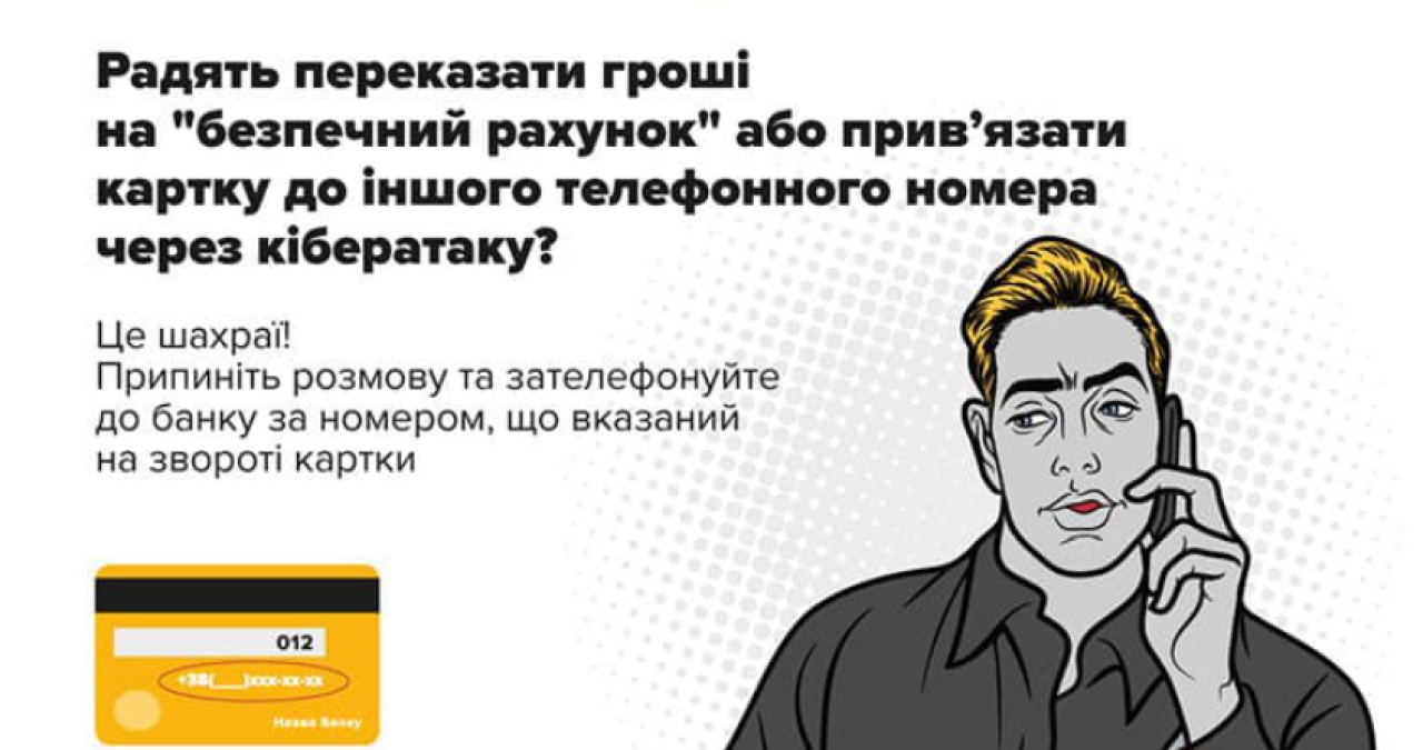 Також не забувайте, що справжні банківські працівники ніколи не питатимуть ці дані телефоном, а в разі потреби запропонують вам особисто прибути до відділення банку та з’ясувати виниклу проблему там;