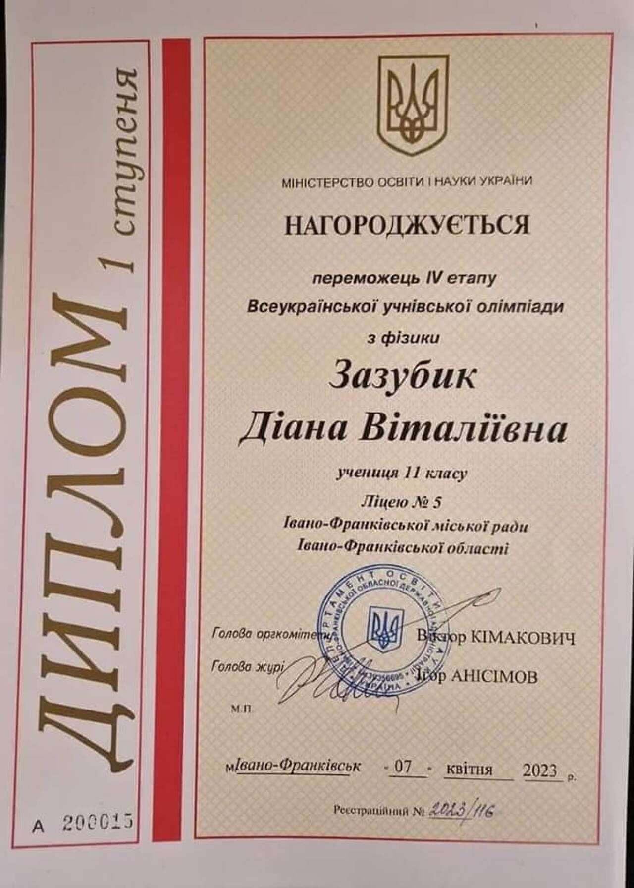 На LVII Всеукраїнську олімпіаду до Івано-Франківська з'їхалися понад сотня кращих фізиків нашої держави. Прикарпатський регіон представляли шість учасників. А найкращий результат продемонструвала учениця 11 класу Ліцею №5 м. Івано-Франківськ Діана Зазубик - І абсолютне місце. Ще з команди області Диплом ІІІ ступеня виборов отримав учень Тустанського ліцею Владислав Коростіль.