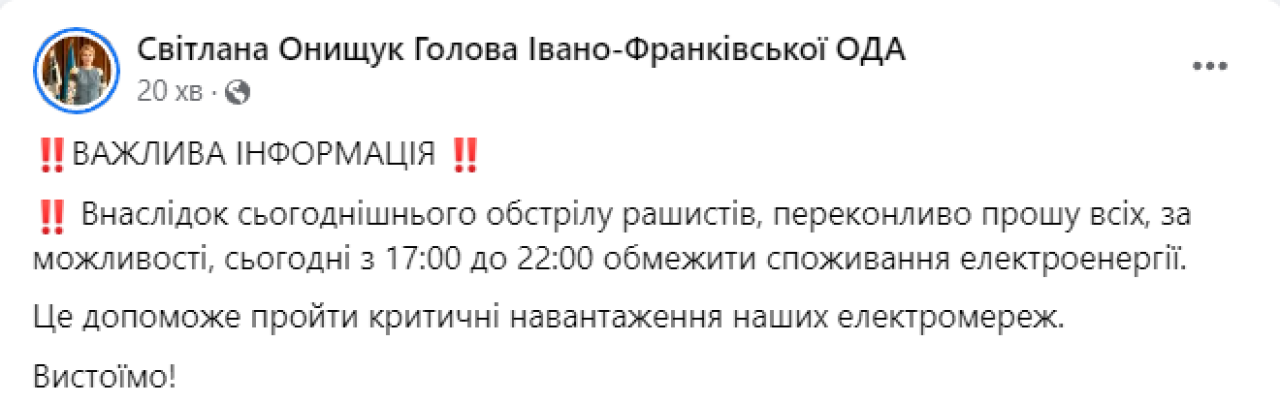 Голова Івано-Франківської ОВА закликала обмежити споживання електроенергії сьогодні з 17:00 до 22:00.