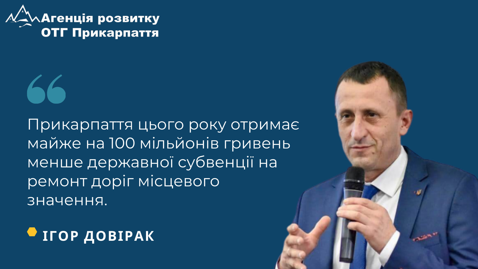 Прикарпаття цього року отримає майже на 100 мільйонів гривень менше державної субвенції на ремонт доріг місцевого значення, повідомив Суспільному голова Асоціації ОТГ Прикарпаття, керівник Печеніжинської громади Ігор Довірак.