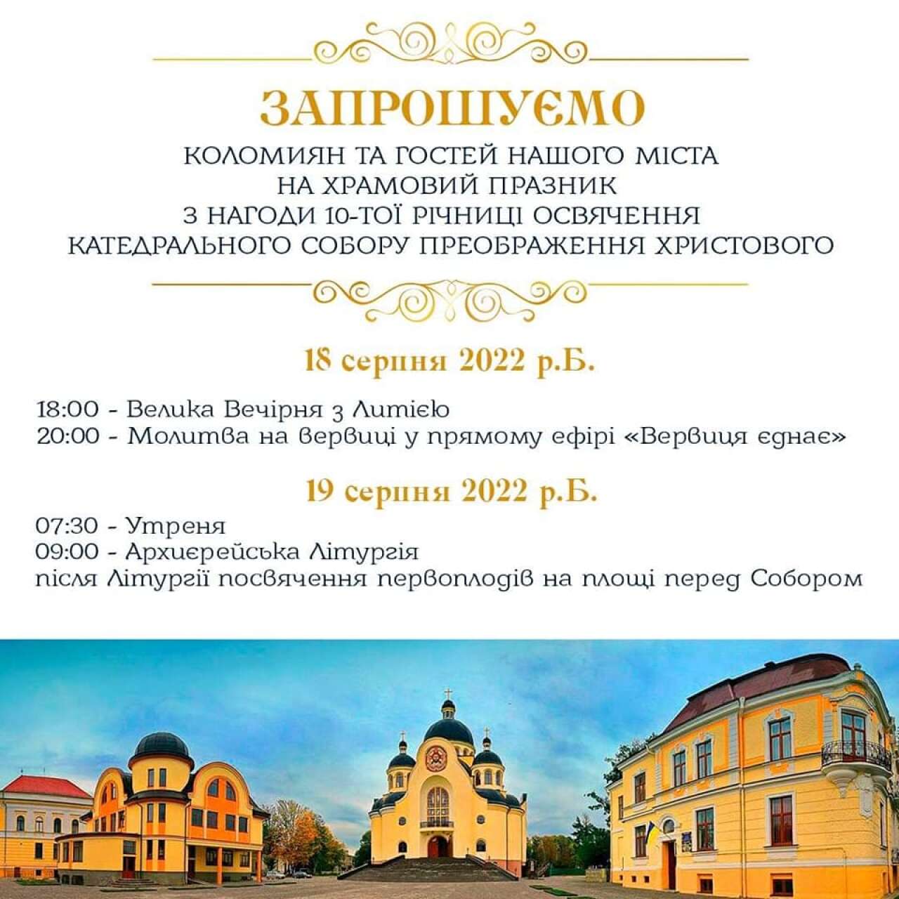 Як повідомляють на сайті Коломийської єпархії ПЦУ, 19 серпня 2022 року, з нагоди престольного свята Преображення Господа нашого Ісуса Христа, у Кафедральному Соборі Преображення Господнього міста Коломиї, Преосвященний Єпископ Коломийский і Косівський Юліан, у співслужінні духовенства, звершить Архієрейську Божественну Літургію, Чин Малого освячення води та благословення плодів.