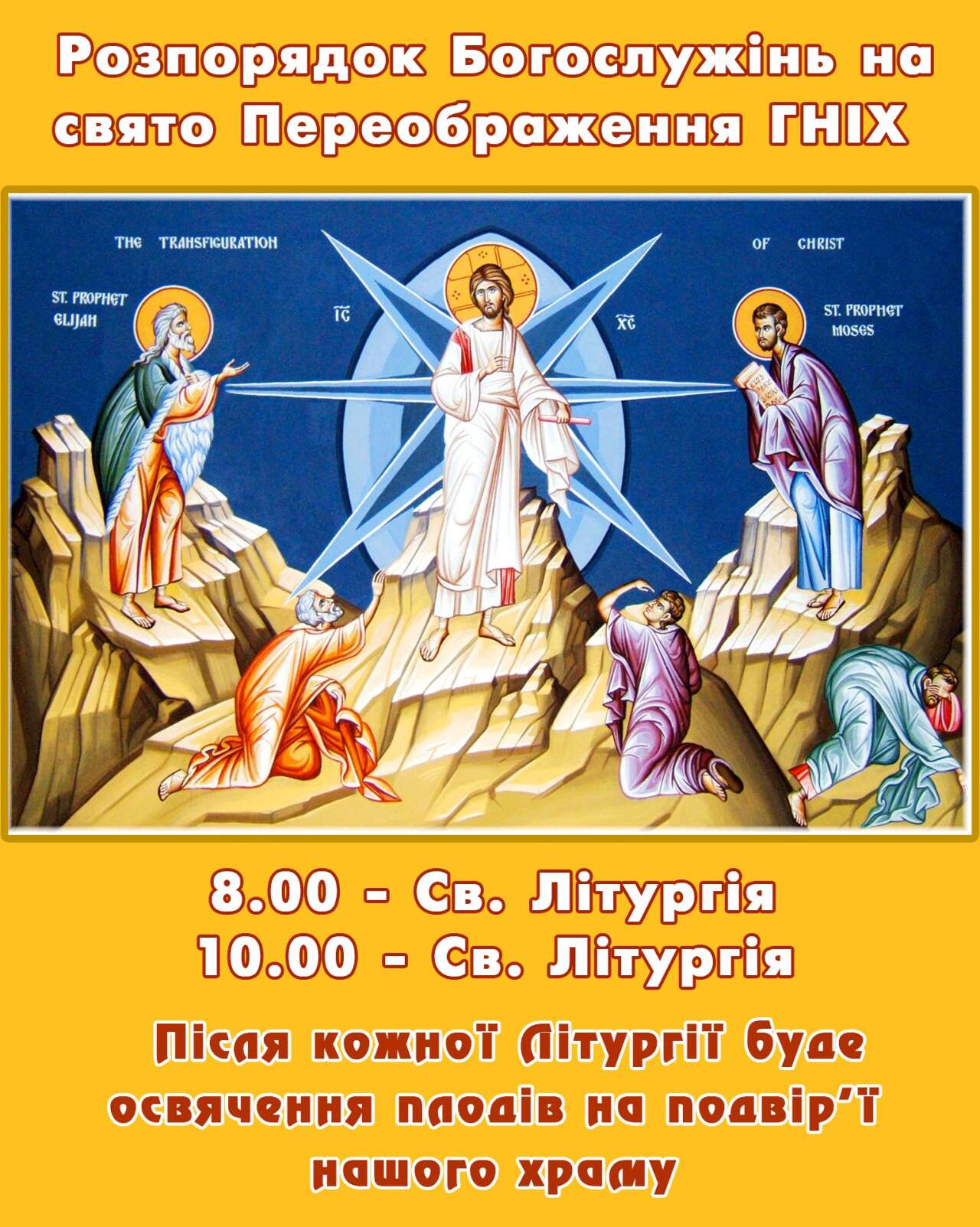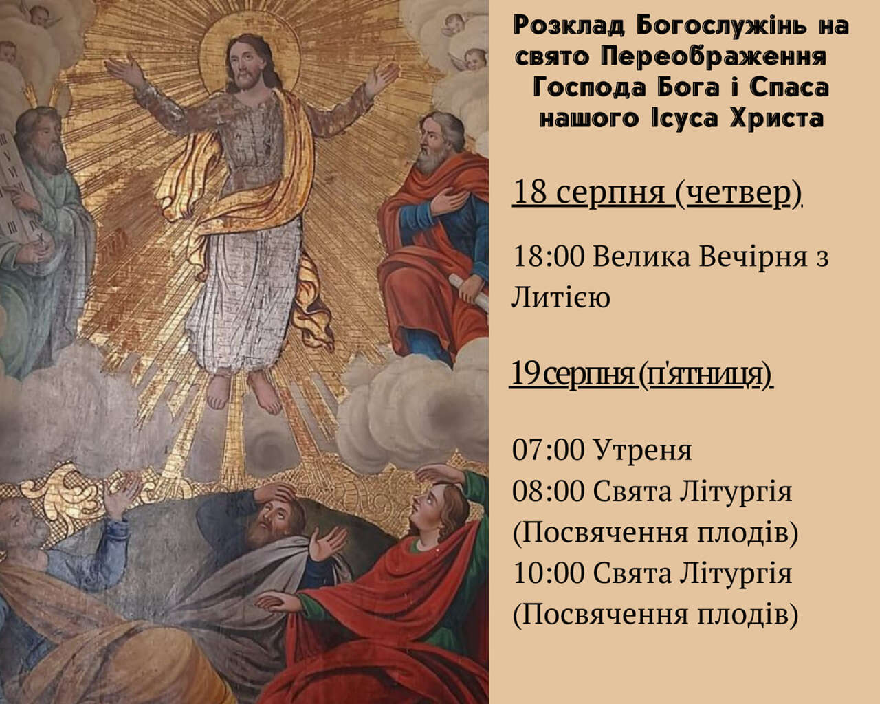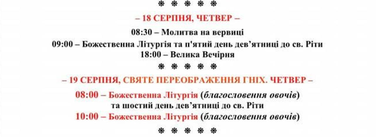 Напередодні, 18 серпня, Святкова Всеношна з Літією. Початок о 17:00 год.