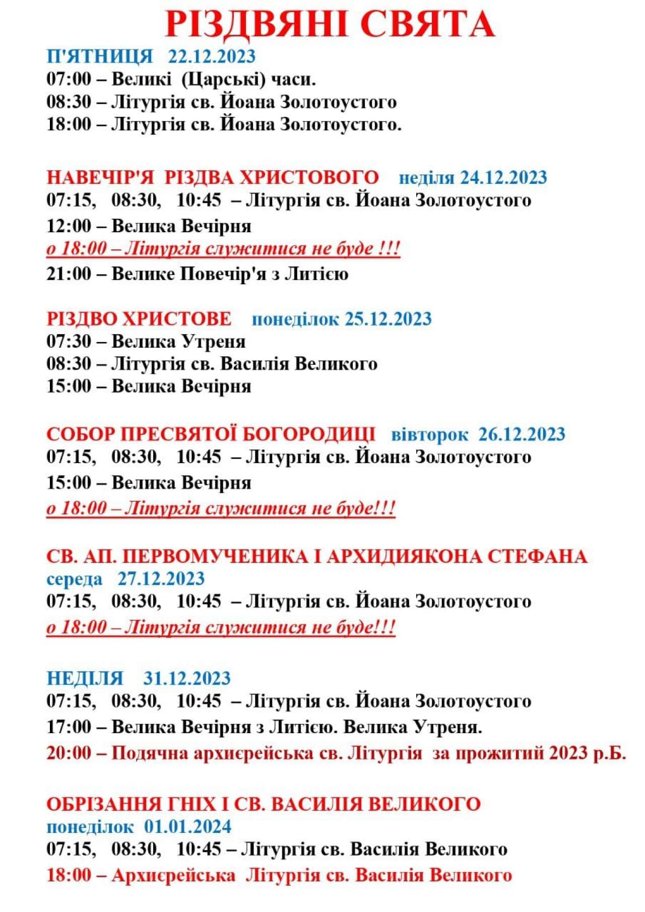 ПОНЕДІЛОК 18.12.2023 р. Мчч. Севастіана та воїнів його: Никострата скарбника, дружини його Зої, Касторія, Транквилліна, пресвітера, начальника над тюрмами, сина його Симфоріана, брата його Вікторана, Тивуртія і Кастула (бл.287) 9:00 год. – Акафіст святому Архістратигу Михаїлу 17:00 год. – Молебень ВІВТОРОК 19.12.2023 р. Мч. Воніфатія (290). Прп. Іллі Муромця, Києво-Печерського, в ближніх печерах (бл.1188) 8:00…