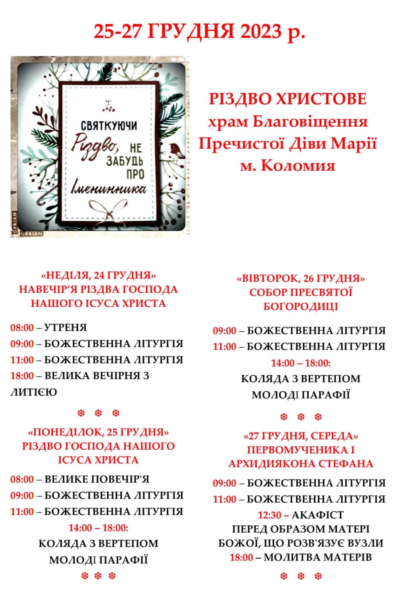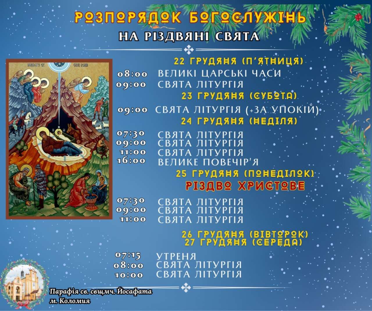 Вашій увазі розклад Різдвяних богослужінь у головних храмах Коломиї.