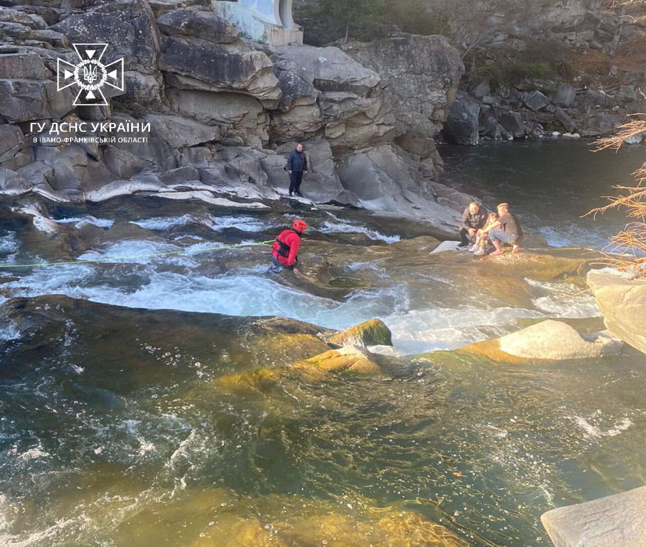 Врахувавши ситуацію, рятувальники у спеціальних костюмах , страхуючи один одного, перейшли поміж камінням воду, глибиною 1 метр, та дістались до людей, котрі потребували негайної допомоги. Спочатку рятувальники на руках перенесли дівчинку на берег, де передали її медикам. Дорослим чоловікам було небезпечно переходити воду самотужки, оскільки каміння було мокрим, а вода холодна, та існувала загроза потрапляння у водоспад. За допомогою рятувальної мотузки чоловіків рятувальники доправили на берег.