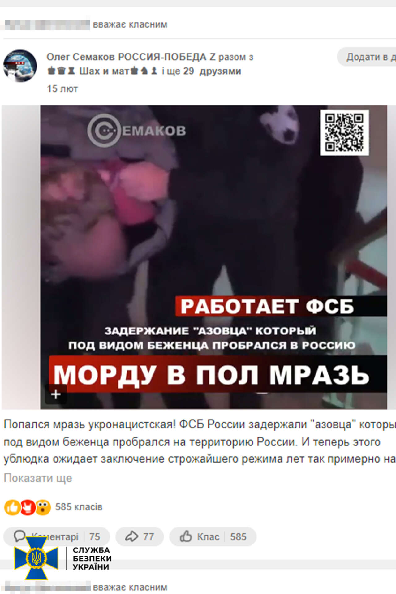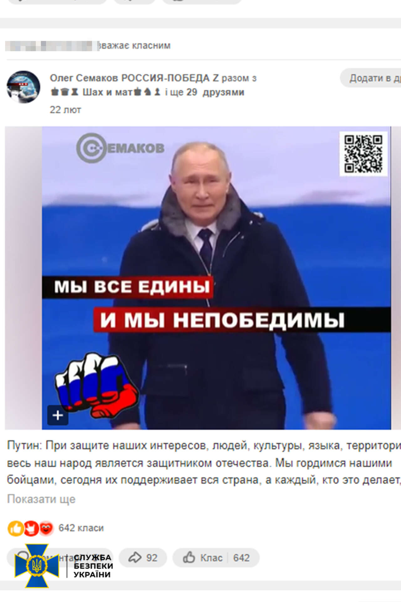 Слідчі СБУ повідомили шанувальнику росії про підозру за ч. 3 ст. 436-2 КК України – виправдовування, визнання правомірною, заперечення збройної агресії російської федерації проти України, глорифікація її учасників.