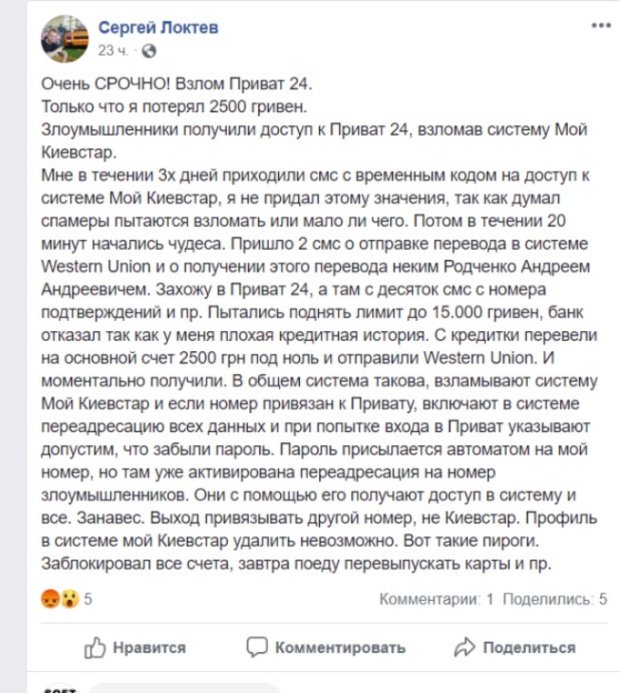 Постраждалий розповів про нову схему зловмисників через Приват24 і Київстар на сторінці в Facebook, пише Дзеркало медіа.
