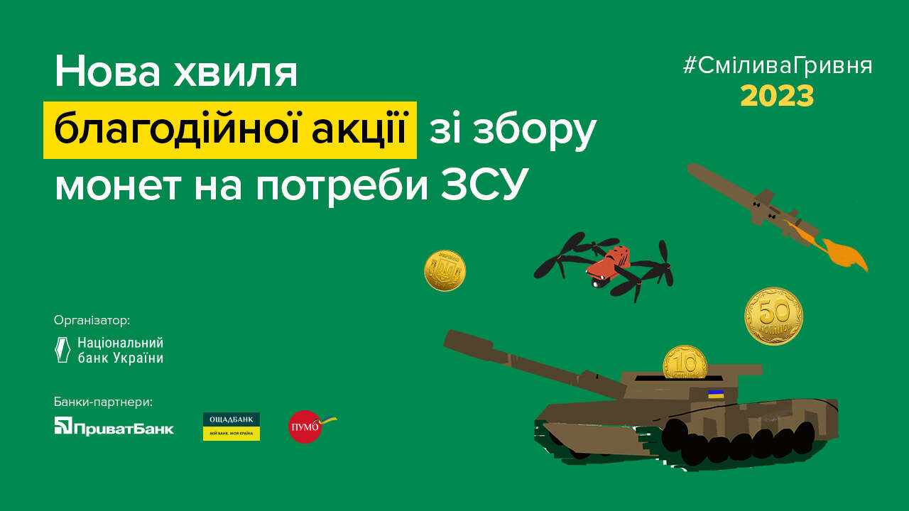 Національний банк України ініціював початок нової хвилі благодійної акції "Смілива гривня". Упродовж наступних трьох місяців – з 4 вересня до 30 листопада 2023 року – по всій Україні триватиме збір монет номіналами 10, 50 копійок та 1, 2, 5 і 10 гривень. Сума зібраних коштів буде перерахована на потреби Збройних Сил України.