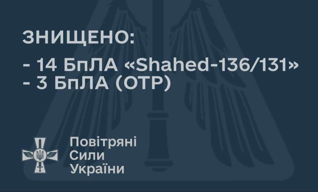 Підрозділами протиповітряної оборони повітряного командування «Схід» Повітряних Сил знищено 11 «шахедів», ще 3 дрони на східному напрямку збиває ППО Сухопутних військ.