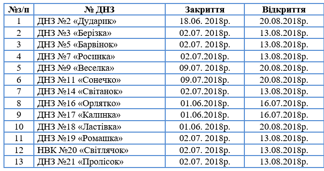 оприлюднило графік роботи закладів дошкільної освіти Коломиї влітку 2018 року.
