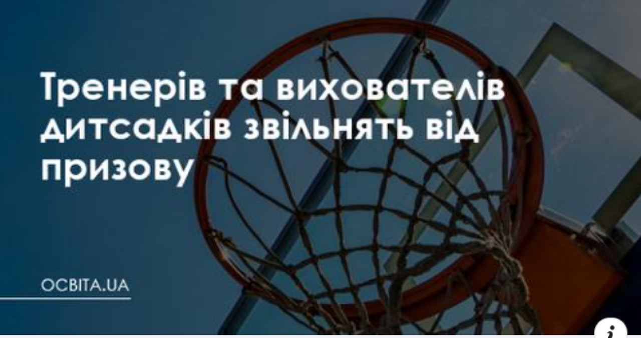 Педагогічних працівників дошкільних навчальних закладів, а також тренерів (тренерів-викладачів) закладів фізичної культури і спорту державної або комунальної форми власності звільнять від призову на військову службу під час мобілізації.