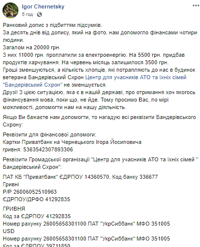 "Гроші зменшуються, а кількість хлопців, які потрапляють до нас в будинок ветерана Центр для учасників АТО та їхніх сімей "Бандерівський Схрон" не зменшується. Друзі! З цією ситуацією, яка є в нашій державі, про отримання хоч якогось фінансування мова, поки що, не йде. Тому просимо Вас, по мірі можливості, допомогти нам на нашу діяльність", - просить Чернецький.Реквізити для фінансової допомоги: Картки Приватбанк на Чернецького Ігора Йосиповича гривня: 5363542307893306 Реквізити Громадської організації "Центр для учасників АТО та їхніх сімей " Бандерівський Схрон": ПАТ КБ "Приватбанк" ЄДРПОУ 14360570, Код банку 336677 Гривні Р/Р 26006052510963 ЄДРПОУ/ДРФО 41292835 ГРИВНЯ Код за ЄДРПОУ 41292835 Номер рахунку 26005658301100 ПАТ "УкрСиббанк" МФО 351005 USD Номер рахунку 26005658301100 ПАТ "УкрСиббанк" МФО 351005 Код за ЄДРПОУ 39711850 Банк бенефіціара 020061151200138 Ukrsibbank Andriivska street 2/12 Kyiv, Ukraine Swift KHABUA2K Банк-посередник BNP Paribas U.S.A- New York Branch New York, USA Swift-code BNPAUS3N EURO Номер рахунку 26005658301100 ПАТ "УкрСиббанк" МФО 351005 Код за ЄДРПОУ 39711850 Банк бенефіціара 07205696 Ukrsibbank Andriivska street 2/12 Kyiv, Ukraine Swift-code KHABUA2K Банк-посередник BNP Paribas SA Paris, France Swift-code BNPAFRPP