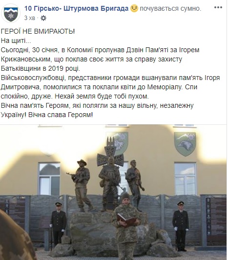 Сьогодні у Коломиї пролунав Дзвін пам'яті за Ігорем Крижановським, який загинув, виконуючи службові обов'язки, у Муратовому Луганської області 30 січня 2019 року.