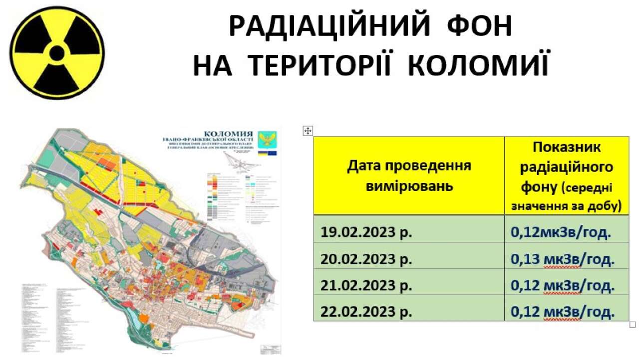 Фахівці Коломийського районного відділу ДУ «Івано-Франківський обласний центр контролю та профілактики хвороб МОЗ України» здійснюють щоденний моніторинг радіаційного фону на території обслуговування. Станом на 22.02.2023 р. показники радіаційного фону знаходяться в межах природних фонових значень і становлять 0,12- 0,13мкЗв/год. при пороговому значенні до 0,32 мкЗв/год..