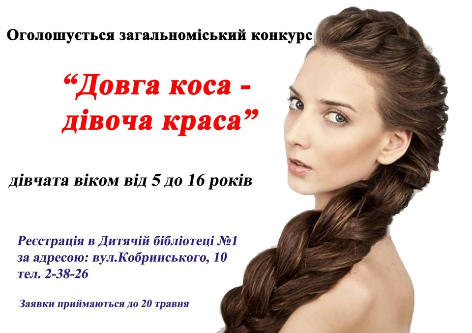 Міський відділ культури і бібліотека №1 для дітей запрошують дівчат Коломиї віком від 5 до 16 років взяти участь у конкурсі "Довга коса – дівоча краса".