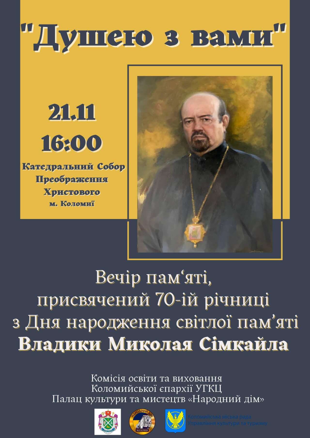 21 листопада у Катедральному Соборі Преображення Христового УГКЦ (вул. Театральна) відбудеться вечір пам'яті "Душею з вами", присвячений 70-ій річниці від дня народження сл. п. Владики Миколая Сімкайла.
