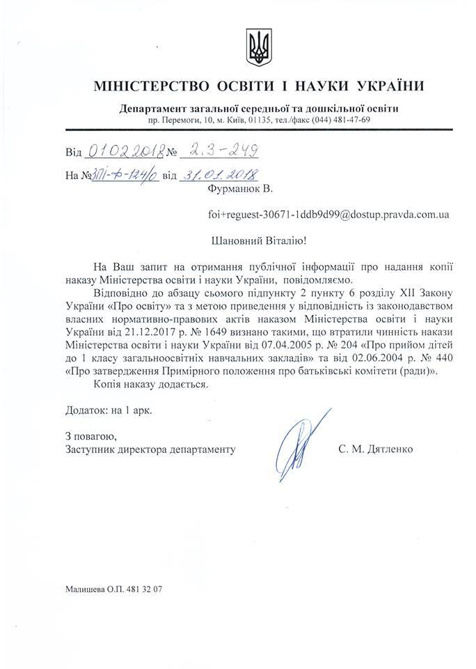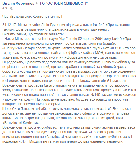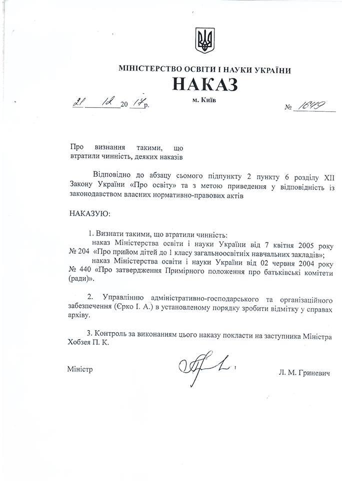 "Час "Батьківських комітетів" пройшов! 21.12.17. Міністр освіти Лілія Гриневич підписала наказ №1649 "Про визнання такими, що втратили чинність, деяких наказів", - написав він.