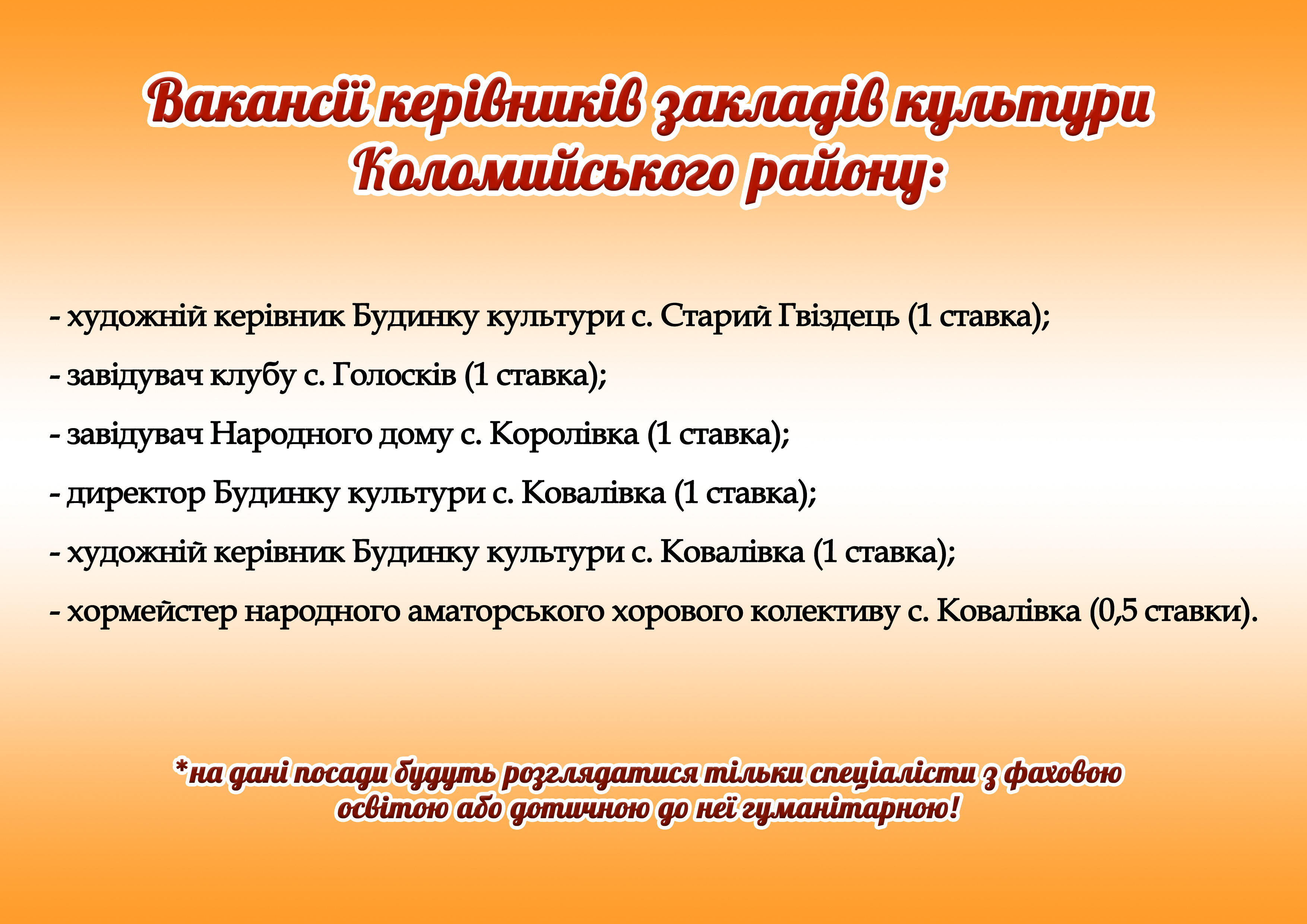 Відділ культури Коломийської районної державної адміністрації повідомляє про вакансії у закладах культури району.