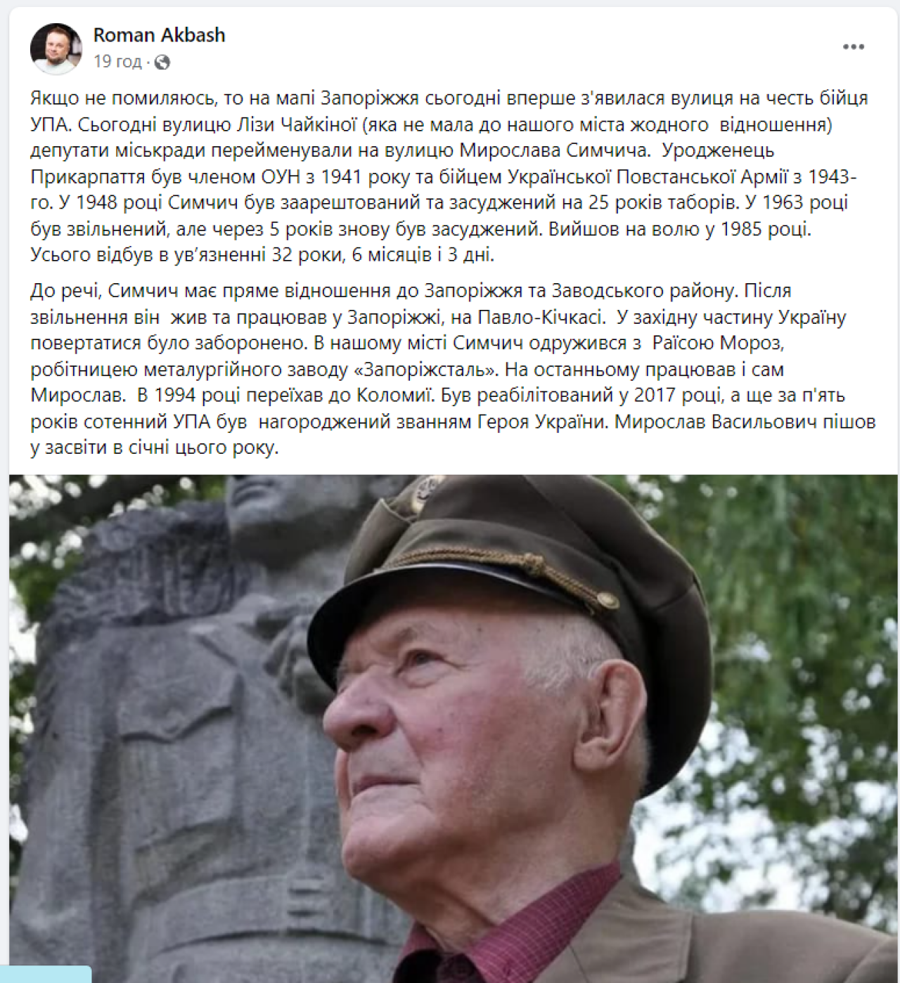 У Запоріжжі перейменували вулицю на честь сотенного УПА з Івано-Франківщини Мирослава Симчича.