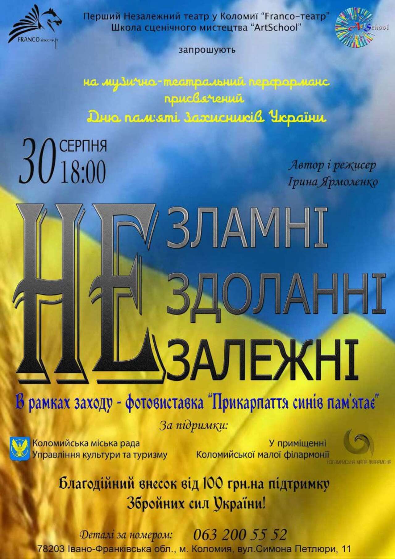 У зв'язку з днями жалоби за полеглим героєм Олександром Негричем, Музично-театральний перформанс "НЕЗЛАМНІ, НЕЗДОЛАННІ, НЕЗАЛЕЖНІ", присвячений Дню пам'яті захисників України перенесли на 18 год. 30 серпня.