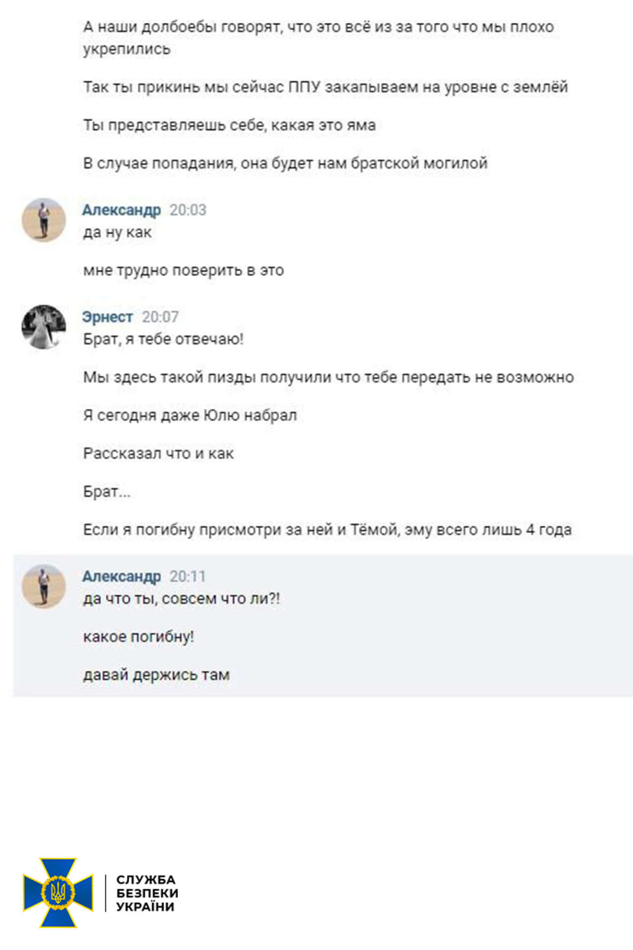 «Тут полный пиз*ец. Наших тупо пачками убивают, я столько трупов не видел никогда. Мы отошли из Чернобаевки, там сущий ад! Там наших столько погибло, что ты себе и представить не можешь. Мы здесь такой пиз*ы получили, что передать невозможно…» – пише він своєму знайомому, який перебуває в рф.