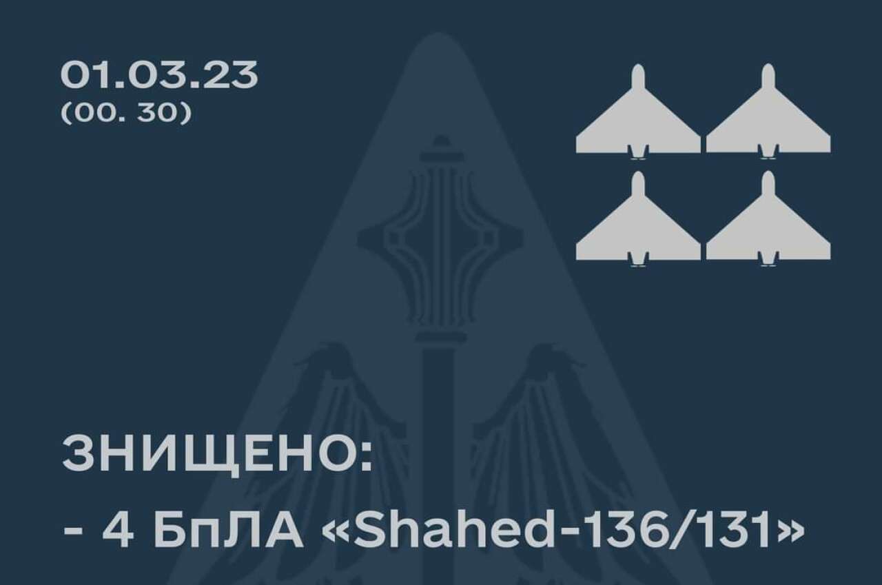 Усі чотири БпЛА-камікадзе знищено силами та засобами протиповітряної оборони, повідомили у Командуванні Повітряних Сил.