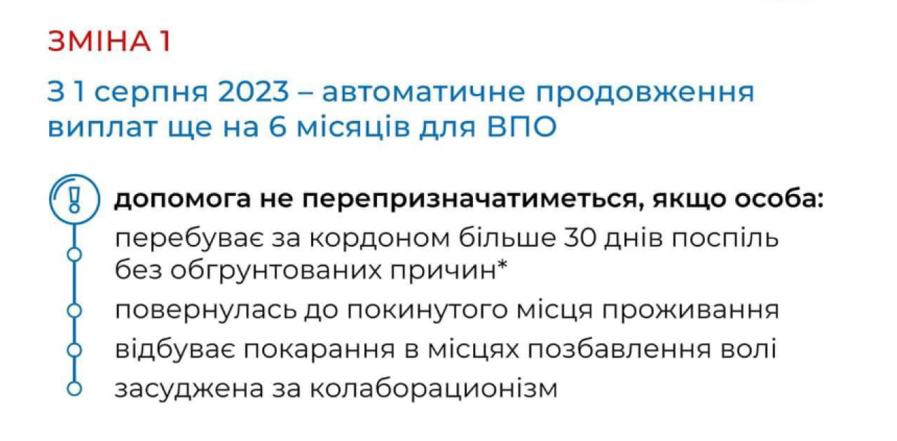 Для всіх внутрішньо переміщених людей, які отримують допомогу зараз, з 1 серпня 2023 р. буде автоматично продовжено виплату допомоги ще на 6 місяців - до кінця січня 2024 р.