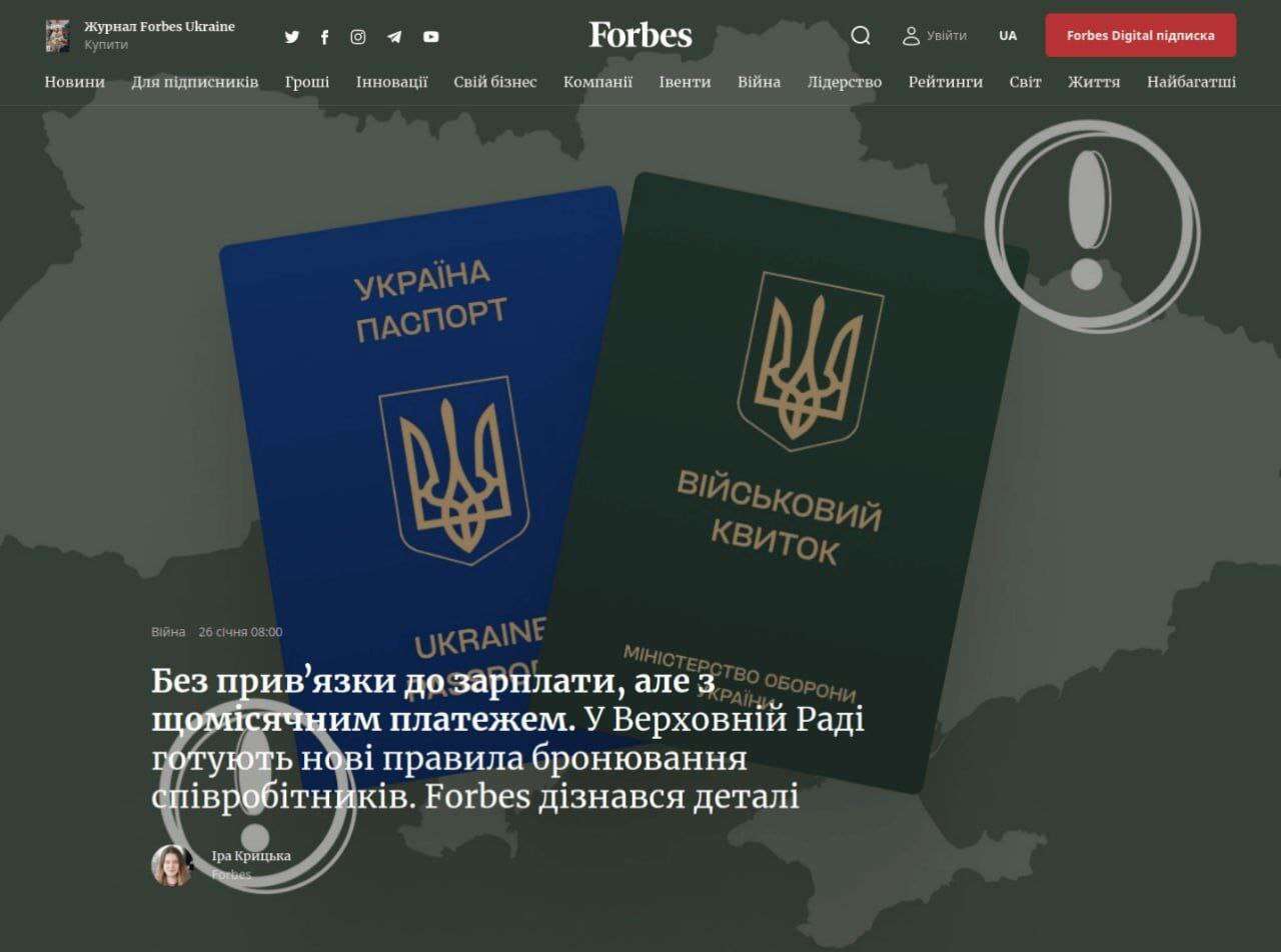 За даними Forbes, депутати розробляють законопроєкт, в якому пропонують ваести щомісячний платіж за відстрочку від мобілізації.