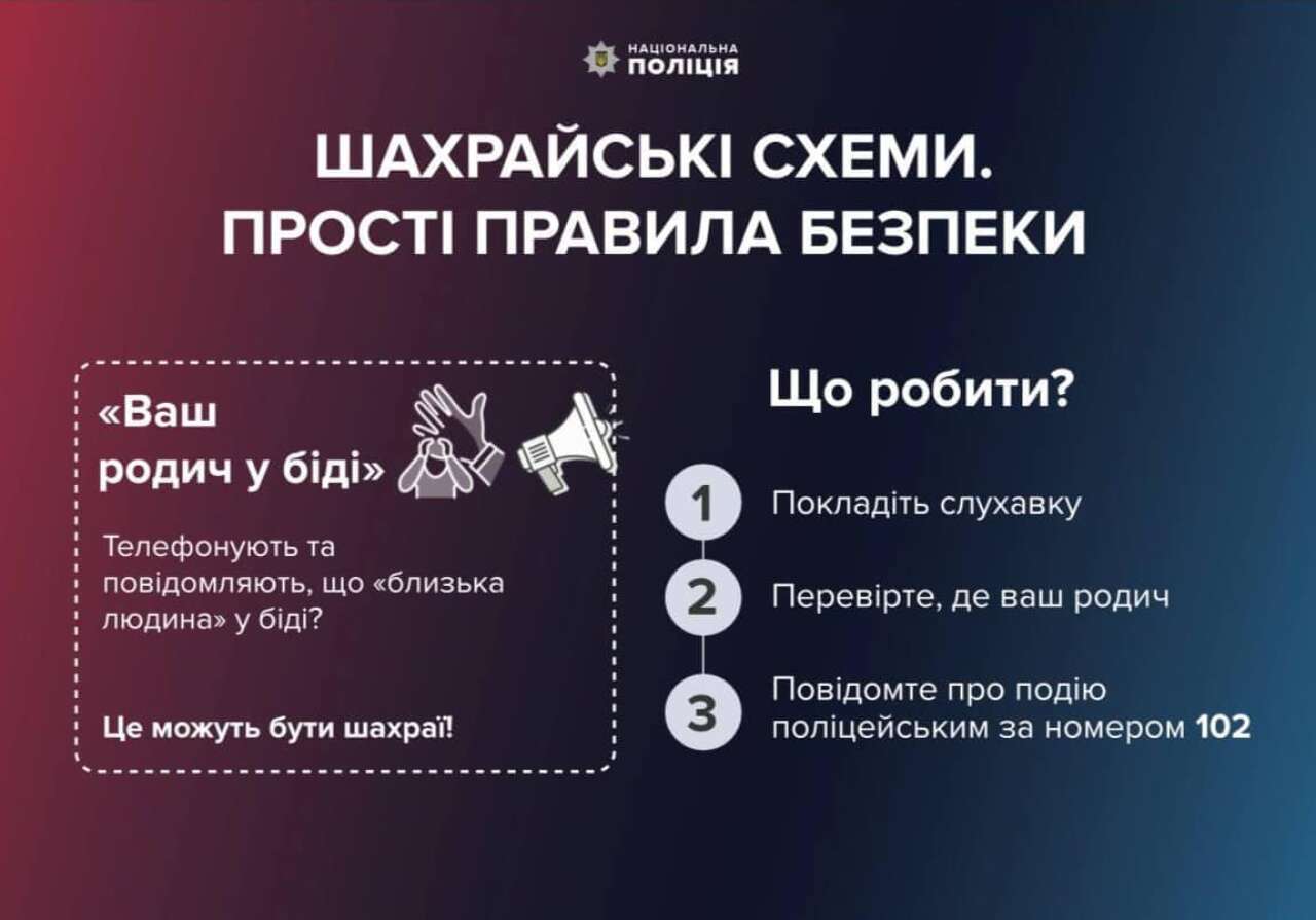 Зловмисники можуть видавати себе за сина/дочку, онука/онучку, які начебто потрапили у біду (скоїли ДТП, опинилися у поліції тощо).