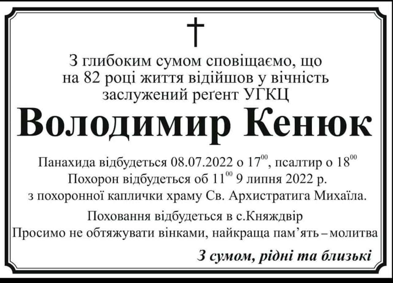 На 82-му році життя відійшов у вічність відомий диригент Володимир Кенюк. Сумну звістку повідомили на сторінці Собору Святого Архистратига Михаїла, де Володимир Кенюк багато років був реґентом хору «Аксіос».