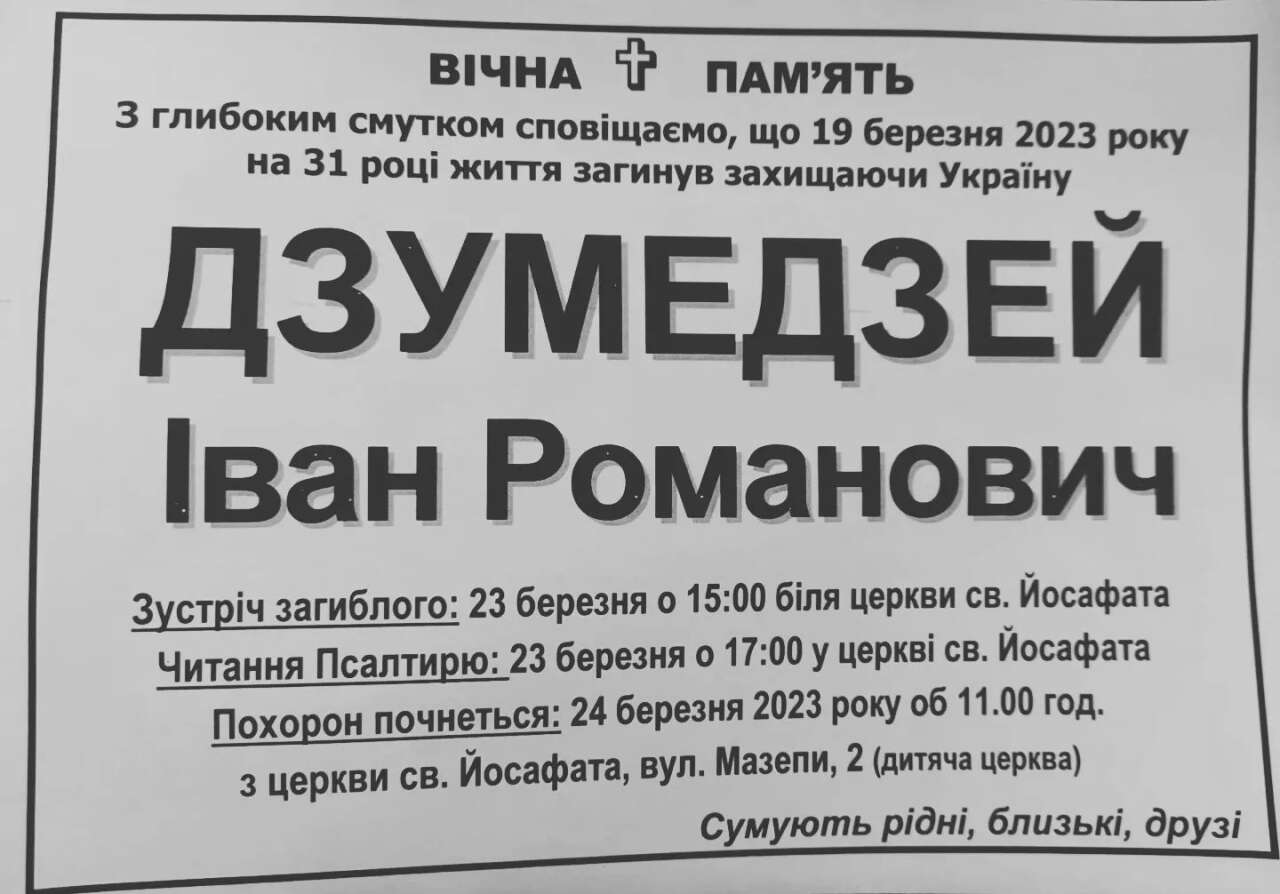 Іван Дзумедзей, 1993 р. н., добровольцем став до лав 10 ОГШБр. Служив навідником кулеметника в Соледарі та на Бахмутському напрямку.