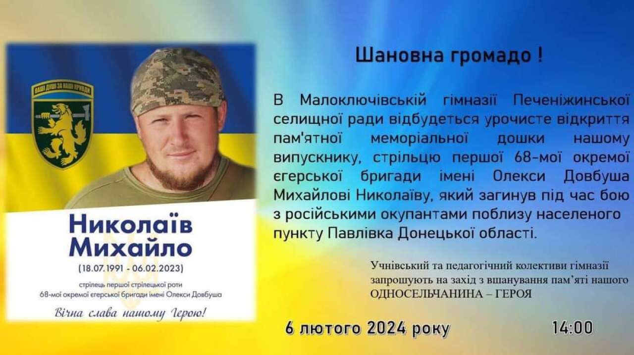 6 Лютого відбудеться відкриття меморіальної дошки в пам’ять про загиблого Героя, уродженця села Малий Ключів - Михайла НИКОЛАЇВА, який загинув в бою з окупантами на Донеччині. Вшанування пам'яті воїна розпочнеться о 14:00 на території Малоключівської гімназії.