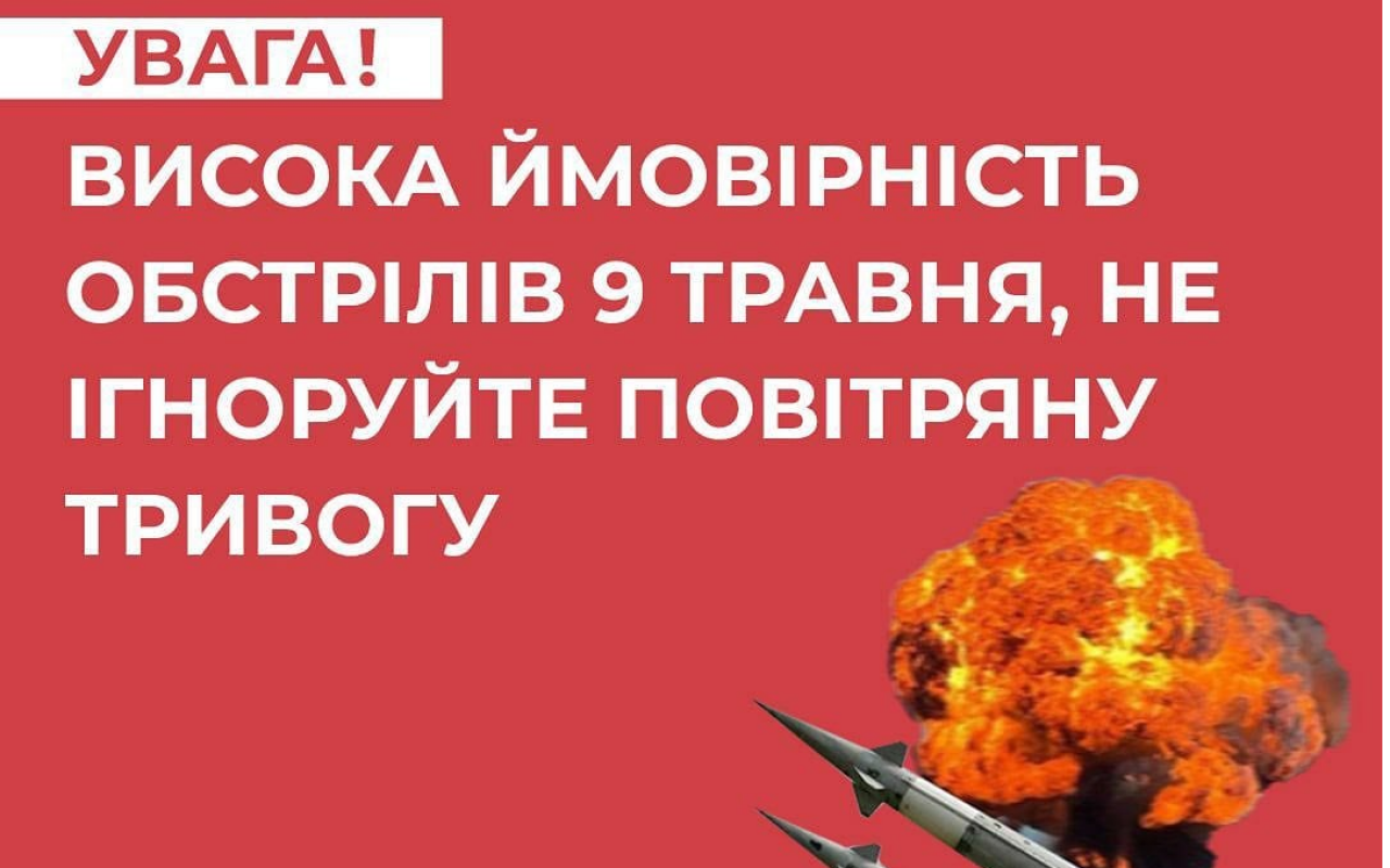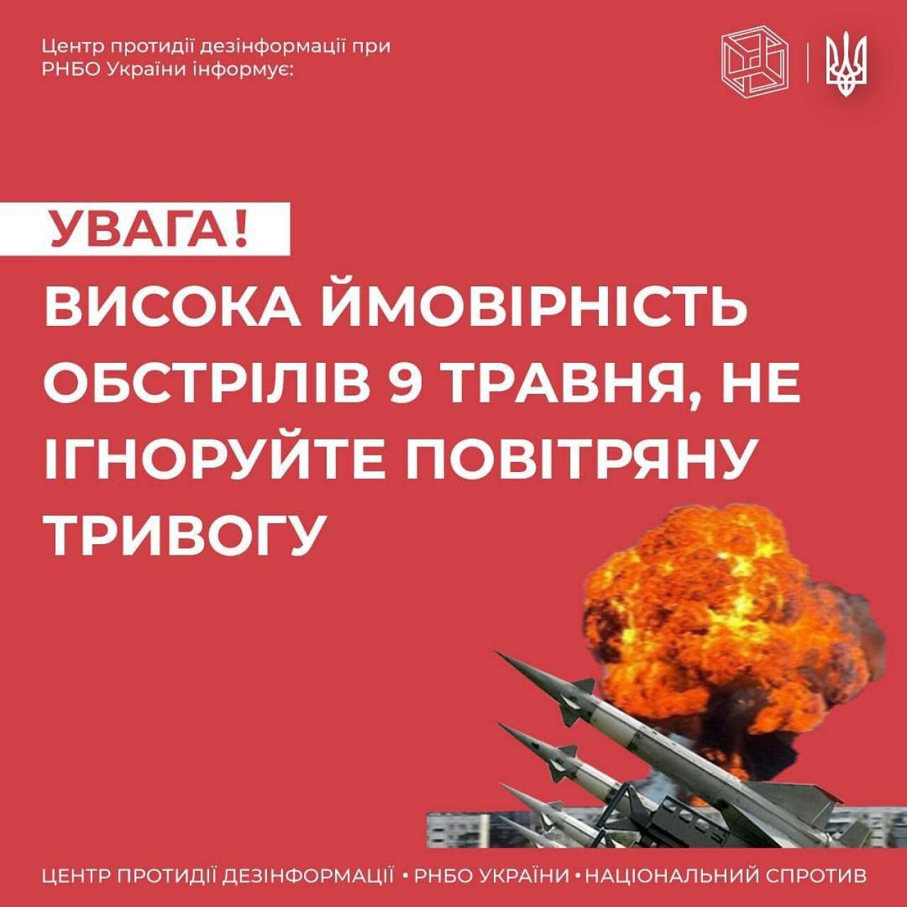 Центр протидії дезінформації при РНБО України закликає напередодні та під час 8-9 травня бути особливо уважними до сигналів повітряної тривоги.