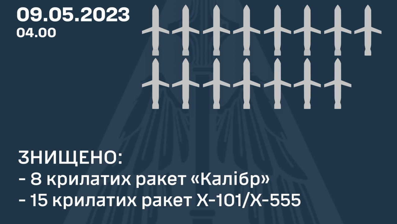 Загалом за дві хвилі обстрілу України у ніч на 9 травня 2023 року російські окупанти здійснили пуски 25 крилатих ракет Калібр та Х-101/Х-555.