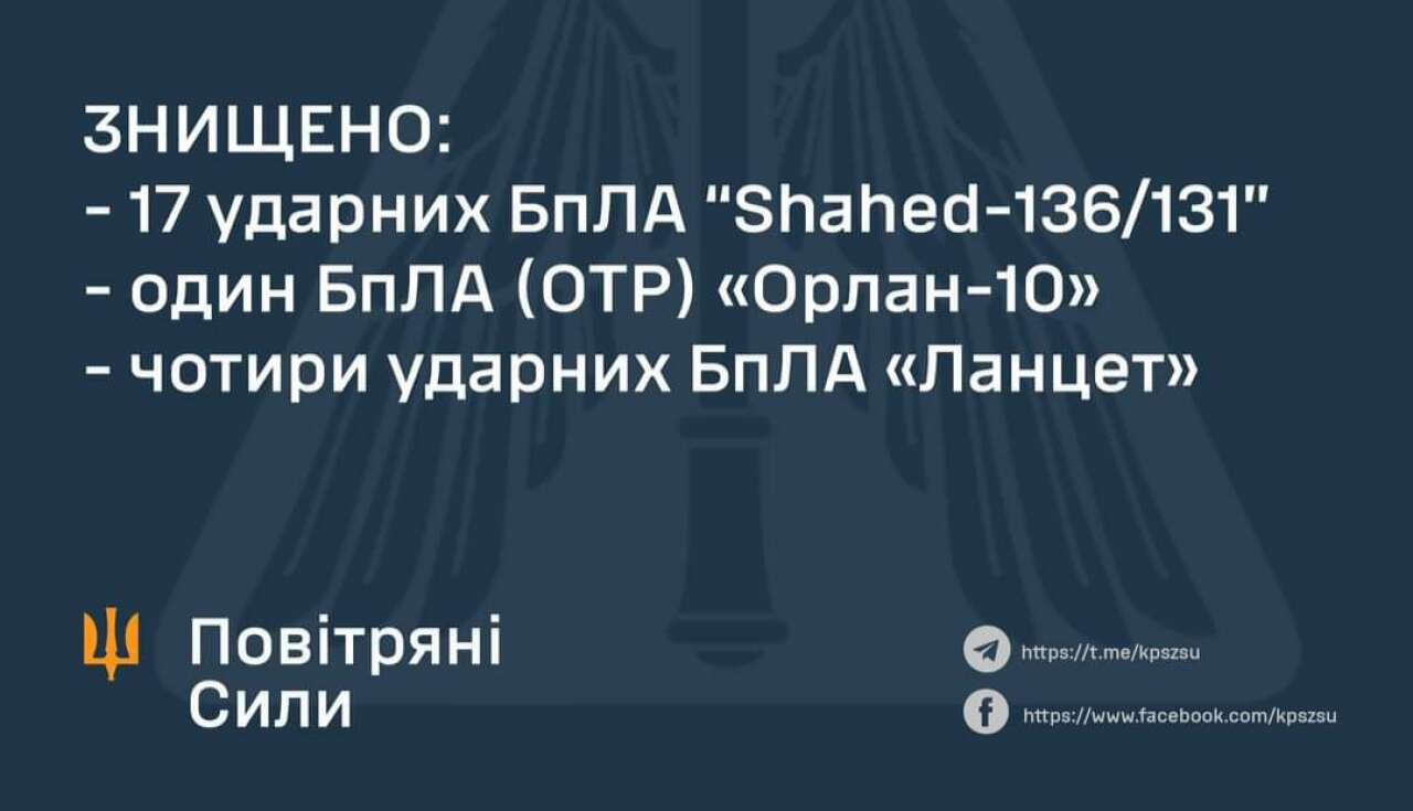 Усього зафіксовано 21 пуск. На різних напрямках знищено 17 баражуючих боєприпасів із застосуванням зенітного ракетного озброєння, винищувачів, мобільних вогневих груп.