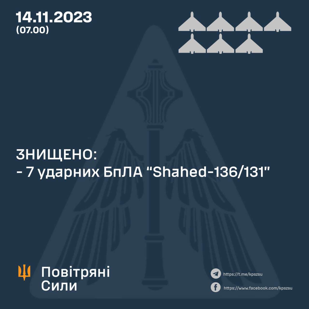 У ніч на 14 листопада 2023 року окупанти атакували Україну ударними дронами, балістичною та керованою авіаційною ракетами.