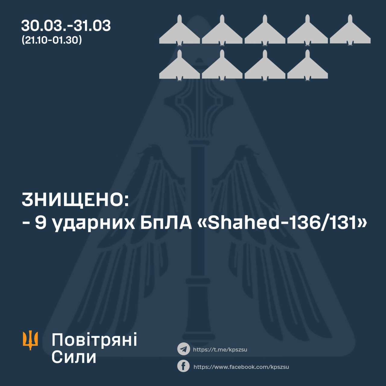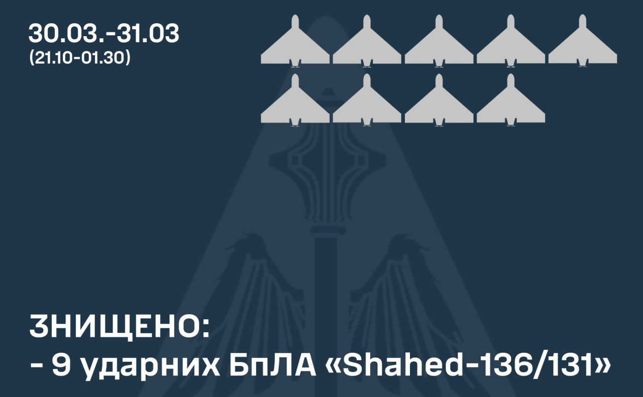 Загалом знищено дев’ять із десяти ударних дронів: один – підрозділом ППО Сухопутних військ та вісім – силами та засобами воїнів Повітряних Сил – зенітних ракетних підрозділів та мобільних вогневих груп Повітряне командування "Схід".