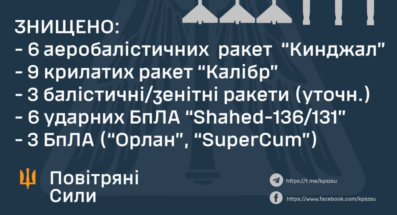 Усі 18 ракет знищені силами та засобами протиповітряної оборони Повітряних Сил ЗС України.