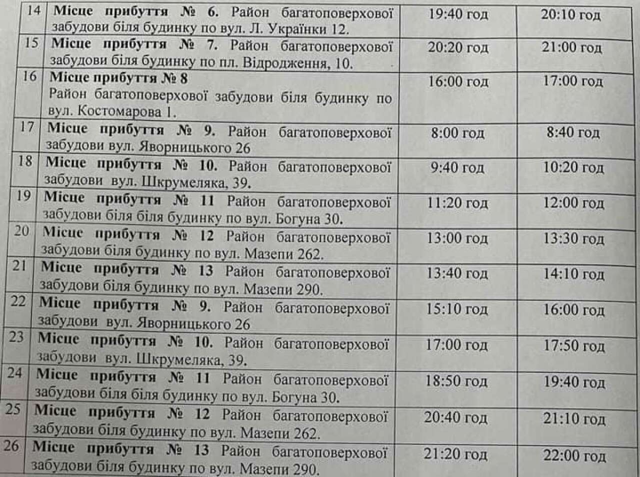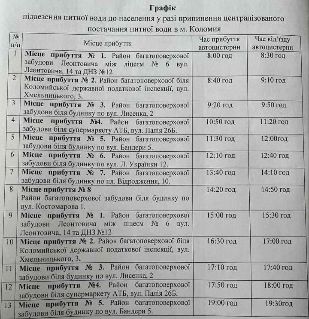 Коломияводоканал повідомляє, що у зв'язку з несвоєчасним завершенням ремонтних робіт підвіз води буде здійснюватися згідно з наступним графіком до повного відновлення водопостачання.