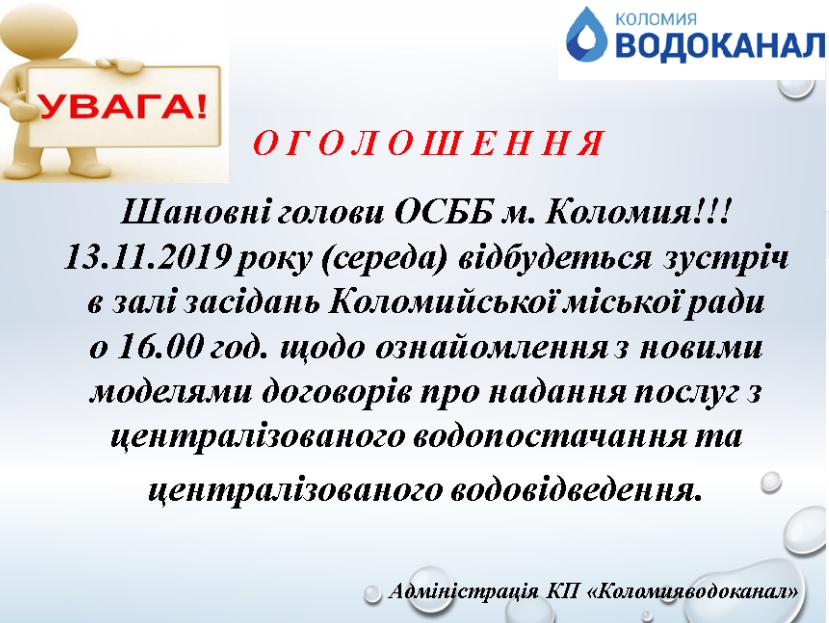 Завтра, 13 листопада, "Коломияводоканал" запрошує голів ОСББ на зустріч щодо нових договорів на водопостачання.
