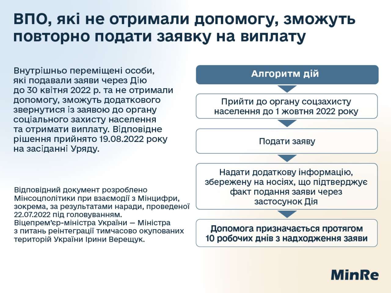 Внутрішньо переміщені особи, які подавали заяви через Дію до 30 квітня 2022 р. але не отримали допомогу, зможуть додаткового звернутися із заявою до органу соцзахисту населення та отримати виплату. Відповідне рішення прийнято сьогодні на засіданні Уряду.