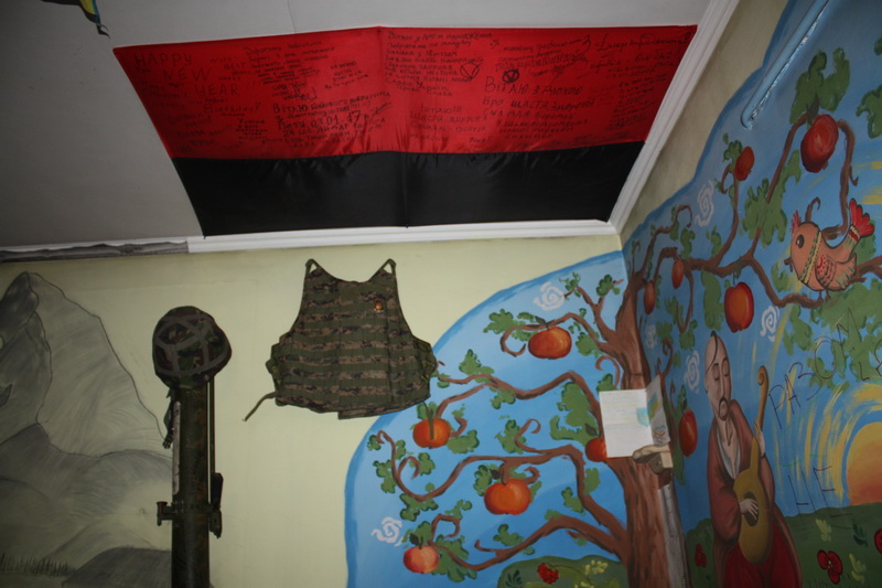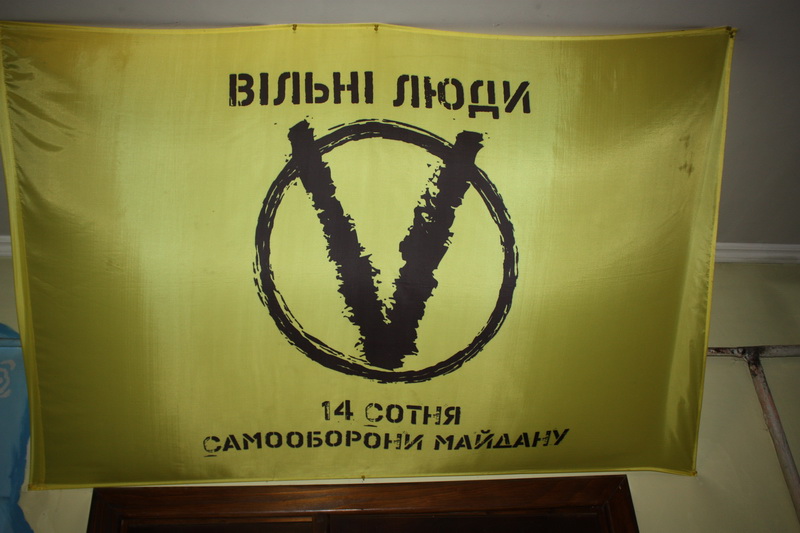 На вході до кімнати в помешканні Андрія в очі кидається плакат – «Вільні люди. 14 сотня самооборони Майдану». Зліва на стіні намальований козак сидить під яблунею і грає на кобзі. Поруч – бронежилет і залишки ручного гранатомета. Під стелею у кутку розписаний червоно-чорний прапор, а на дивані – синьо-жовтий стяг.