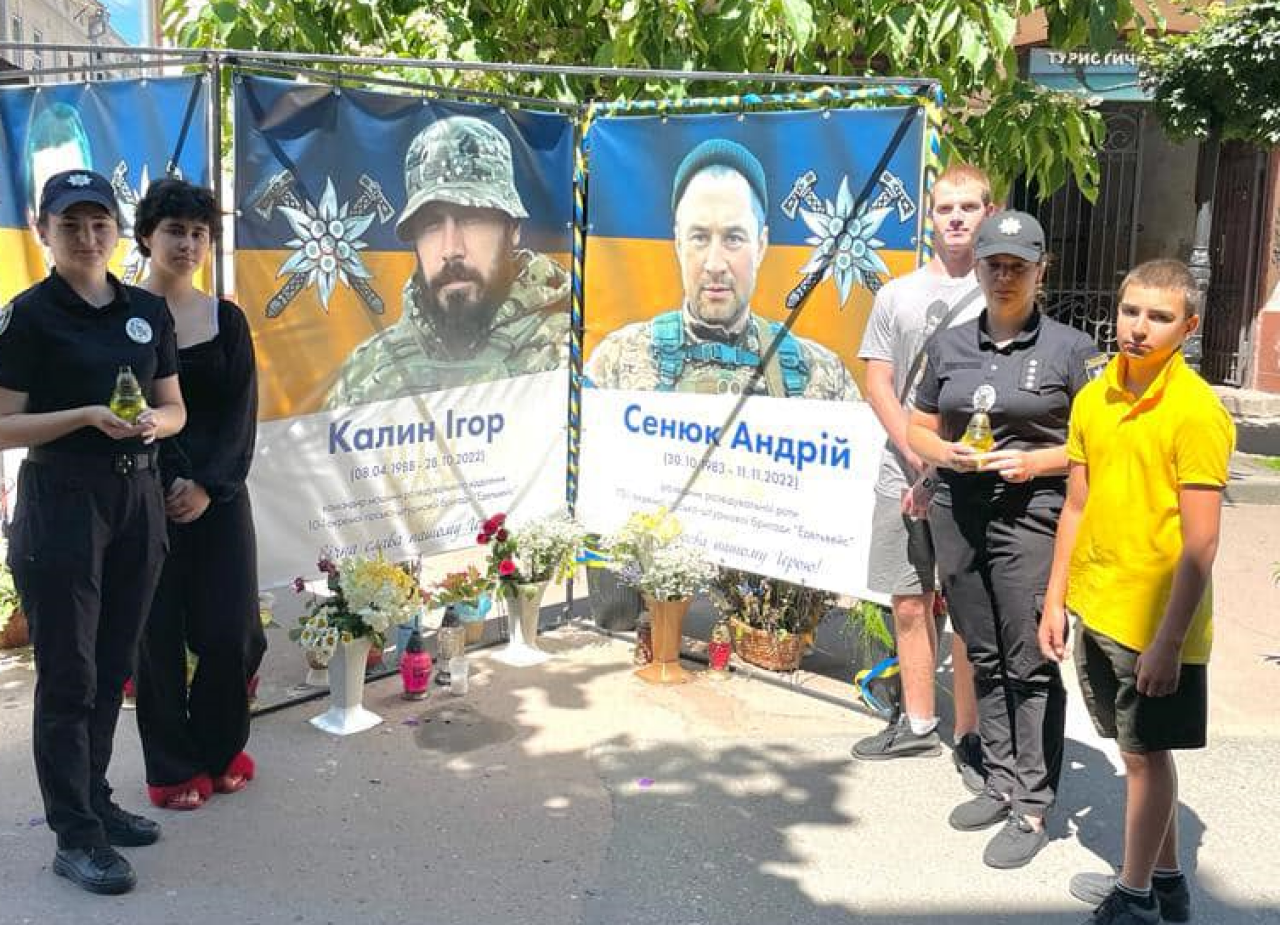 Працівники сектору ювенальної превенції Коломийського РВП разом з дітьми, які перебувають на профілактичному обліку, в центральній частині міста вшанували пам'ять загиблих у війні героїв Коломийщини. В пам'ять про них пов'язали синьо-жовті стрічки.